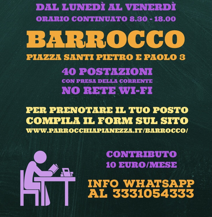 Aula studio per studenti universitari BARROCCO, ORATORIO Prenota il tuo posto CLICCANDO QUI Scarica il regolamento e il modulo di autocertificazione da consegnare stampato e firmato all’ingresso